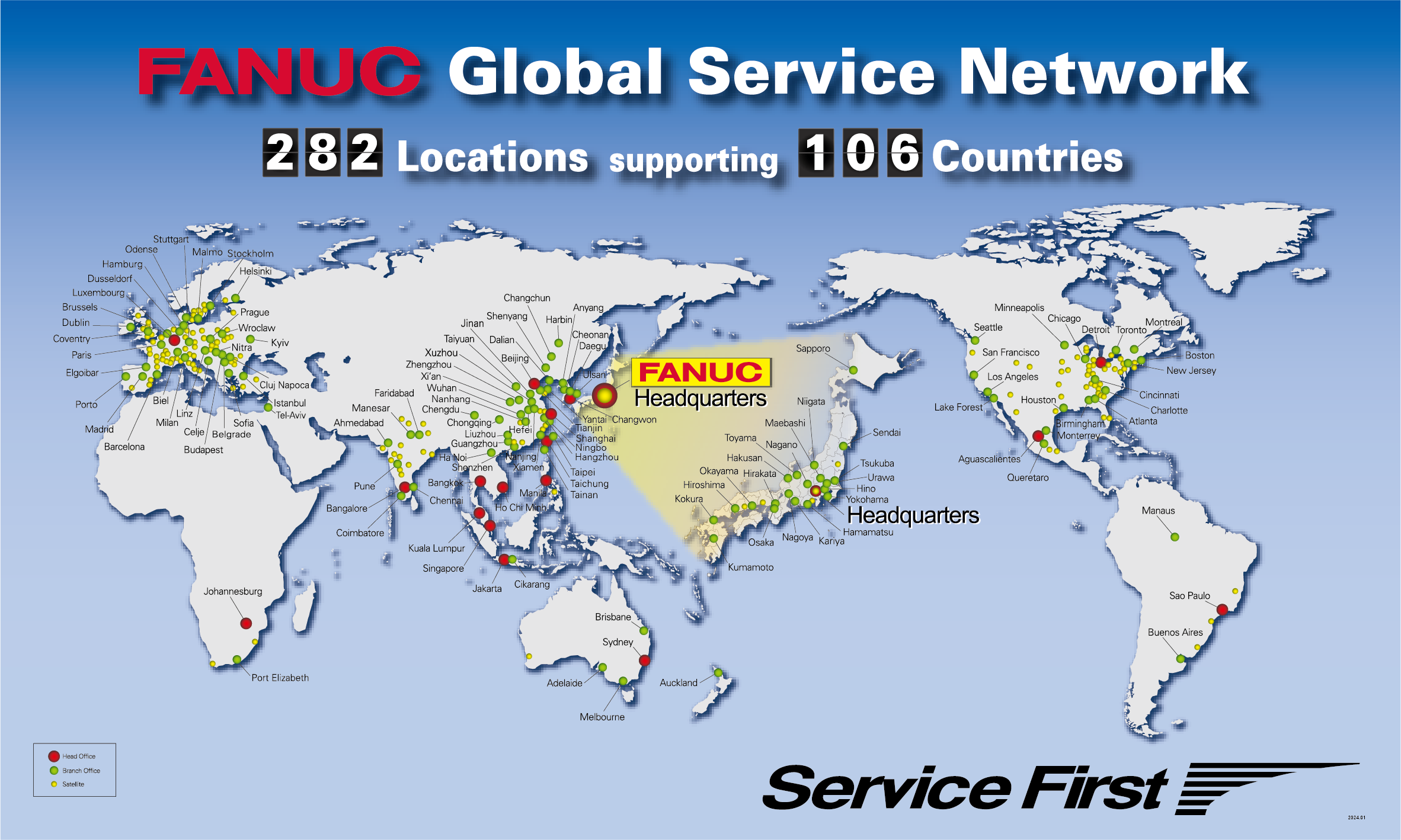 發(fā)那科公司在全世界建立了282個(gè)服務(wù)網(wǎng)點(diǎn), 為106個(gè)國(guó)家和地區(qū)全力提供技術(shù)支持